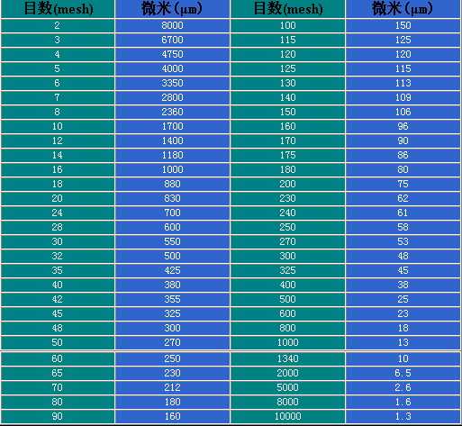 篩網(wǎng)目數(shù)與粒徑對照表以及相關(guān)知識